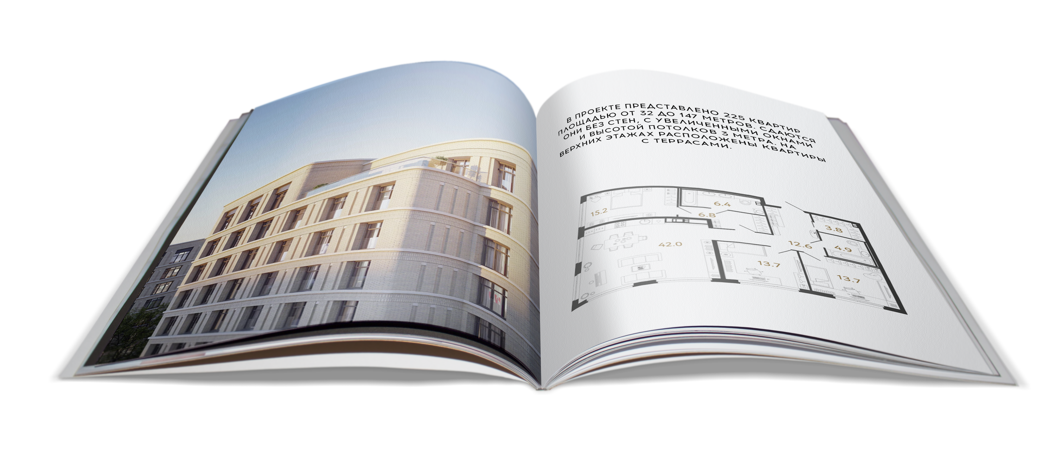 В проекте представлено 225 квартир площадью от 32 до 147 метров. Сдаются они без стен, с увеличенными окнами и высотой потолков 3 метра. На верхних этажах расположены квартиры с террасами.